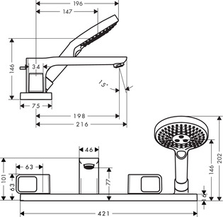 - consists of: 4-hole tile mounted bath mixer, hand shower, shower hose, shower holder