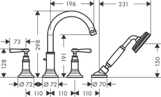 - consists of: 4-hole tile mounted bath mixer, hand shower, shower hose, shower holder